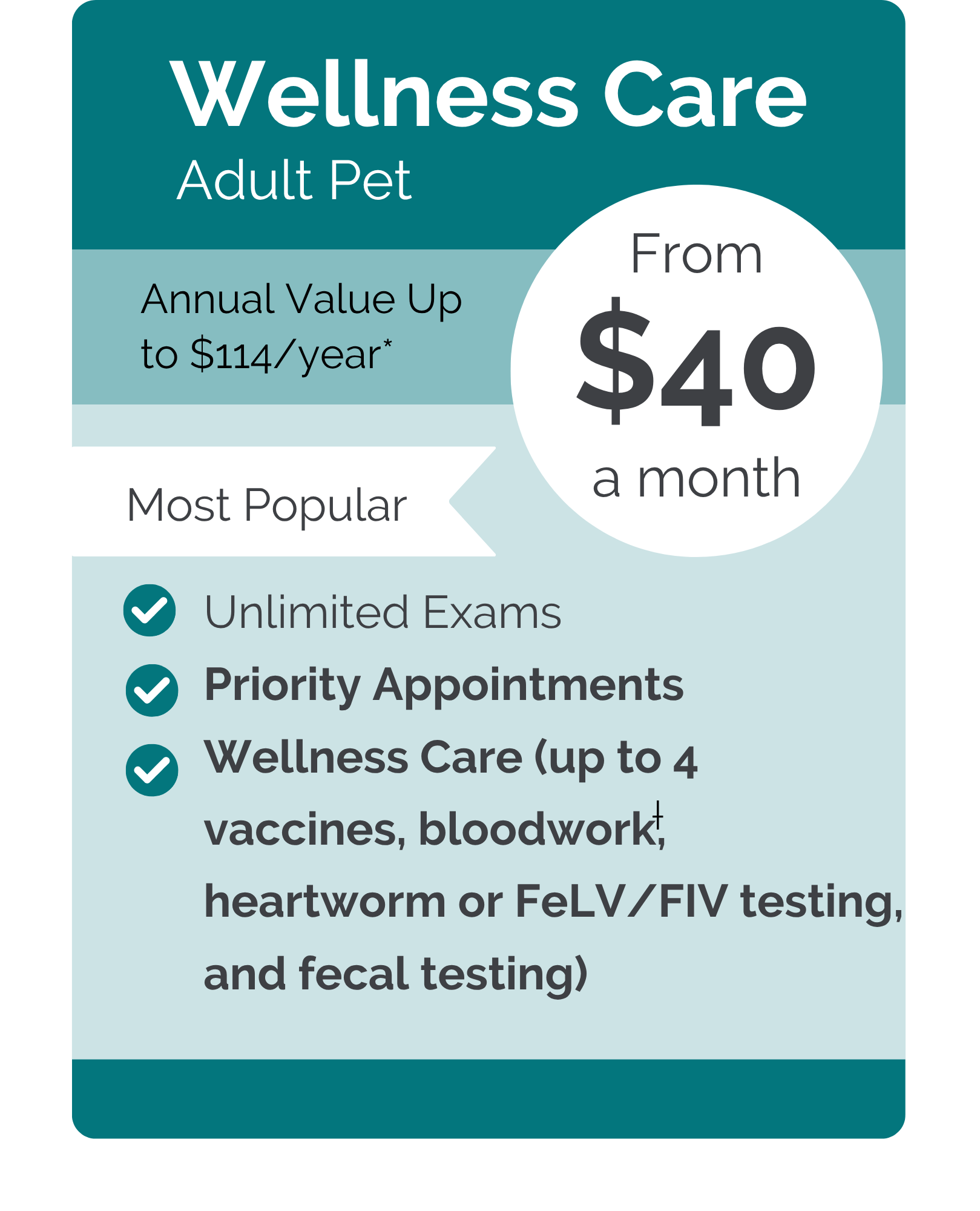 Plus, with our Wellness Care plans, you’ll enjoy priority appointments with same- or next-day scheduling whenever possible. Spread out the cost of services like dental care throughout the year, so you can give your pet the care they need without any financial stress.
